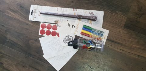 Tote Bag Backpack Wand Socks Writing set (paper, envelopes, sticker seals) 18 x Iron on patches 4 x Rubber Bracelets Drink Bottle Keyring 4 x Pens Hogwarts Wall Banner